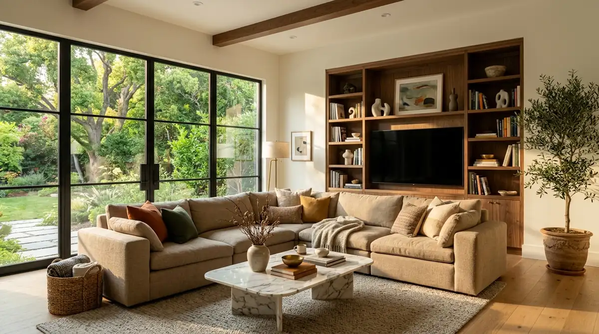 - Furniture scale: Furniture must be proportional to the room. An apartment-sized sofa in a 500 sq ft living room looks lost. Use oversized sectionals, statement armchairs, and substantial coffee tables.