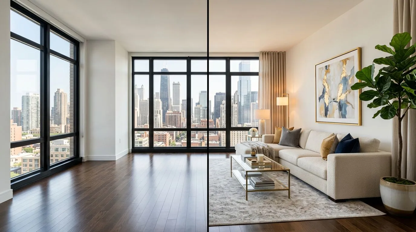 Scenario 1: Empty room needs complete furnishing. An unoccupied property with empty rooms is the most common virtual staging use case. You need to add furniture, decor, rugs, artwork, and lighting fixtures to create an inviting, lived-in appearance.